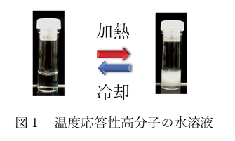 温度応答性高分子と称される一群の高分子は、小分子とは異なる面白い性質をもつことが知られています。日常感覚では、溶けにくい物質を溶かす際には溶液を温めるのが普通だと思います。ところが温度応答性高分子の水溶液は、高分子が低温で溶解し、高温で不溶化する日常感覚とは逆の変な?現象が起こります。(図1)。このような温度応答性高分子は機能性材料への応用が期待されており、特に体温付近で不溶化が起きる温度応答性高分子は、薬物を体内で徐放する薬物送達システムへの応用が期待されています。